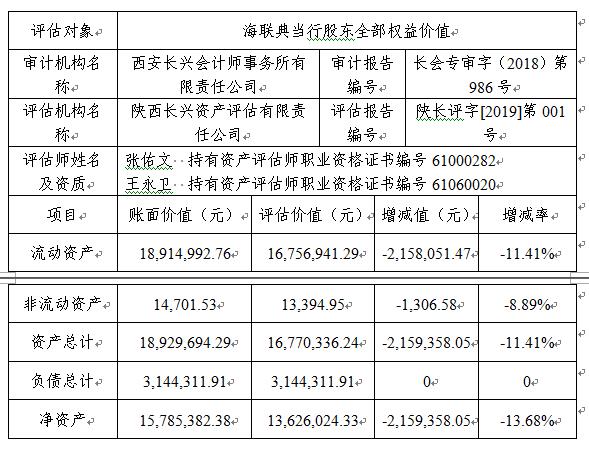 根據(jù)公司第二屆董事會(huì)第二十三次臨時(shí)會(huì)議決議,同意公司將持有的西安海聯(lián)典當(dāng)行有限公司(以下簡(jiǎn)稱“海聯(lián)典當(dāng)行”)48.72%股權(quán)以不低于評(píng)估價(jià)格在國有資產(chǎn)監(jiān)管部門認(rèn)可的產(chǎn)權(quán)交易機(jī)構(gòu)進(jìn)行公開掛牌,并授權(quán)公司經(jīng)營層按照相關(guān)規(guī)定實(shí)施。經(jīng)審批,我公司委托西安長興會(huì)計(jì)師事務(wù)所有限責(zé)任公司、陜西長興資產(chǎn)評(píng)估有限責(zé)任公司分別對(duì)海聯(lián)典當(dāng)行于2018年9月30日的整體資產(chǎn)進(jìn)行了審計(jì)、資產(chǎn)評(píng)估,出具了審計(jì)報(bào)告與評(píng)估報(bào)告,現(xiàn)就該項(xiàng)目的審計(jì)和評(píng)估結(jié)果公示如下: